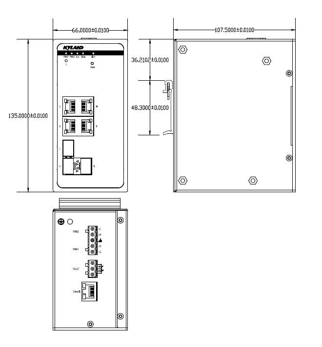 | 機械結構 | 外殼:金屬材質 散熱方式:自然冷卻,無風扇 防護等級:IP40 尺寸:66mm×135mm×107.5mm(W×H×D) 重量:1.25Kg 安裝方式:DIN卡軌式或壁掛式 |