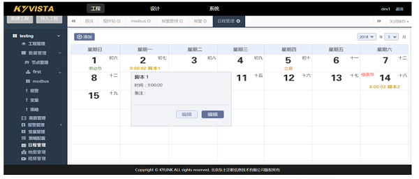 支持kyGate網(wǎng)關(guān)接入配置管理 支持Modbus TCP協(xié)議配置 支持Modbus ASCII協(xié)議配置 支持OPC DA、OPC UA協(xié)議配置 支持Siemens TCP協(xié)議配置 支持Omron Fins TCP協(xié)議配置 支持?jǐn)?shù)據(jù)保存配置 支持開關(guān)量報(bào)警、限值報(bào)警配置 支持內(nèi)存變量定義