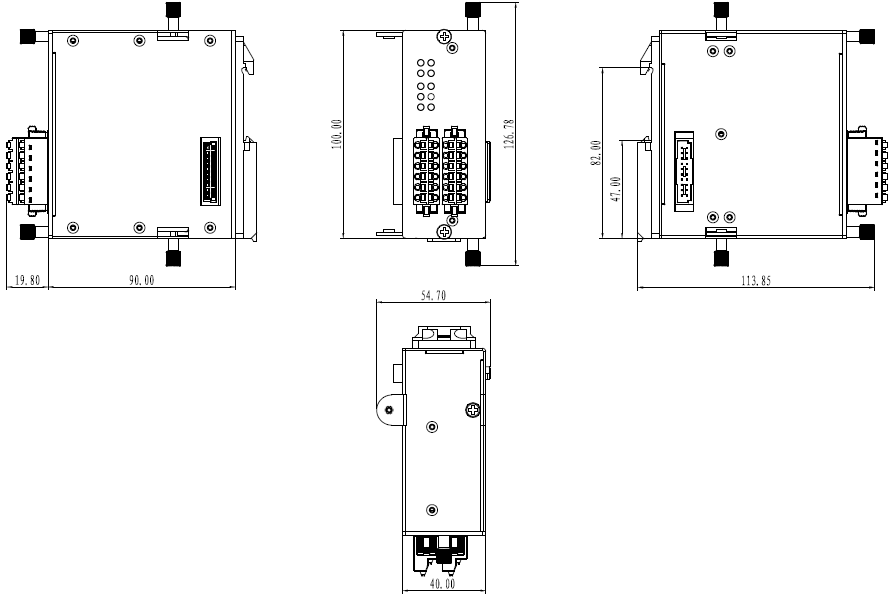 | 機械結(jié)構(gòu) | 機械結(jié)構(gòu) 鋁質(zhì)外殼 防護(hù)等級 IP20 尺寸 40mm x 100mm x 90mm (W x H x D) 整機重量 500g 安裝方式 導(dǎo)軌安裝 |