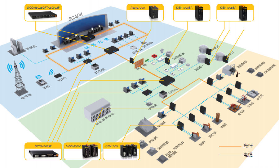 智能化的數(shù)字油氣田建設(shè)需要構(gòu)建一個(gè)安全、高效、可靠的自動化網(wǎng)絡(luò),以提高油田生產(chǎn)、強(qiáng)化生產(chǎn)過程控制、輔助生產(chǎn)管理等。通過有線光纖傳輸網(wǎng)絡(luò)和無線傳輸網(wǎng) 絡(luò),實(shí)現(xiàn)油氣田井區(qū)、計(jì)量間、集輸站、聯(lián)合站、處理廠之間的生產(chǎn)數(shù)據(jù)、設(shè)備狀態(tài)信息實(shí)時(shí)傳輸、共享。并可在作業(yè)區(qū)生產(chǎn)指揮中心及生產(chǎn)控制中心進(jìn)行集中管理 和控制。由于網(wǎng)絡(luò)系統(tǒng)承載了視頻監(jiān)控、采集數(shù)據(jù)和控制數(shù)據(jù),因此,一個(gè)高帶寬,具有優(yōu)良的冗余性、安全性、實(shí)時(shí)性和可靠性的骨干網(wǎng)絡(luò)成為油田自動化的主要需求。
