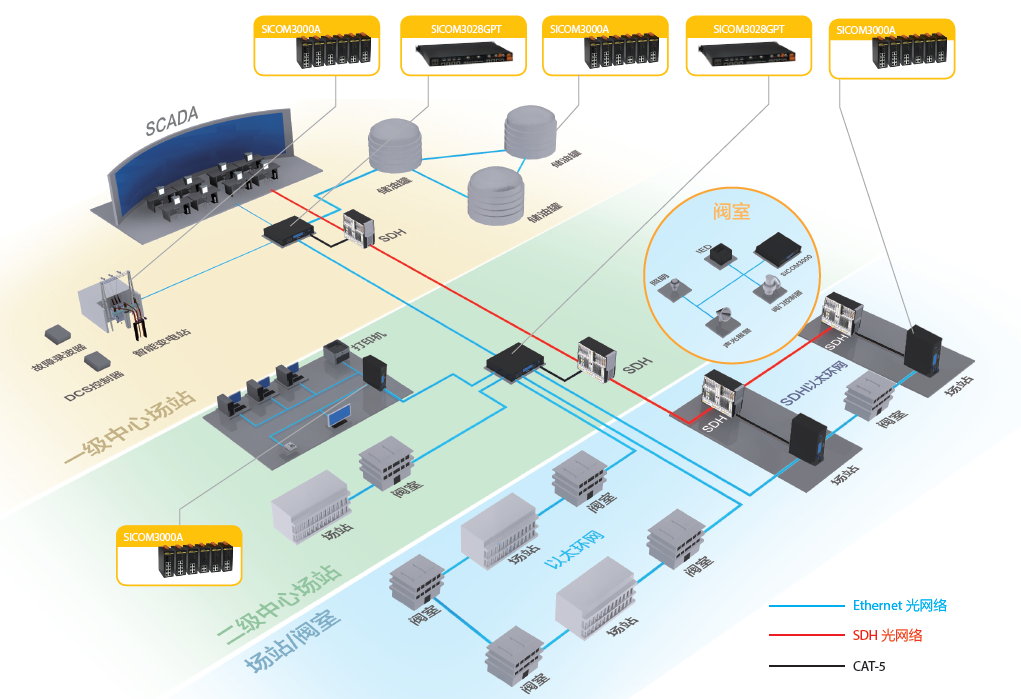 石油/天然氣輸送管線是石油、天然氣輸運的主要途徑之一,其自動化系統主要包括SCADA系統、工業電視系統、語音系統等,網絡通信系統需為各子系統提供實時、穩定的多業務通信平臺。網絡設備分布在調控中心、場站、閥室等節點,各節點間的通信設施有SDH系統或光纖系統,通信設備需具備對各類通信設施的接入能力,并在各種地理環境和自然環境中為SCADA等子系統提供可靠的數據傳輸服務。