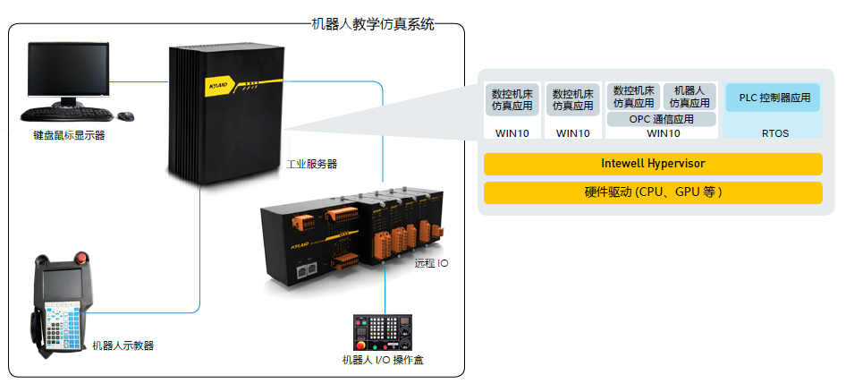 其中,工業(yè)服務(wù)器上裝載Intewell操作系統(tǒng),通過(guò)虛擬化的方式將設(shè)備分為一個(gè)實(shí)時(shí)核和多個(gè)非實(shí)時(shí)核,實(shí)時(shí)核部分運(yùn)行PLC控制器應(yīng)用,非實(shí)時(shí)核部分運(yùn)行控機(jī)床仿真應(yīng)用、機(jī)器人仿真應(yīng)用、PLC編程應(yīng)用等軟件,同時(shí)虛擬化支持顯卡透?jìng)鳎С制聊环指顬槎鄠€(gè)小窗口,方便用戶將多個(gè)應(yīng)用平鋪在一個(gè)屏幕中,從而實(shí)現(xiàn)一臺(tái)設(shè)備完成了原有的多臺(tái)高性能工控機(jī)及一個(gè)控制器等多個(gè)物理設(shè)備所完成的任務(wù),達(dá)到教學(xué)設(shè)備的一體化展示及成本的降低。