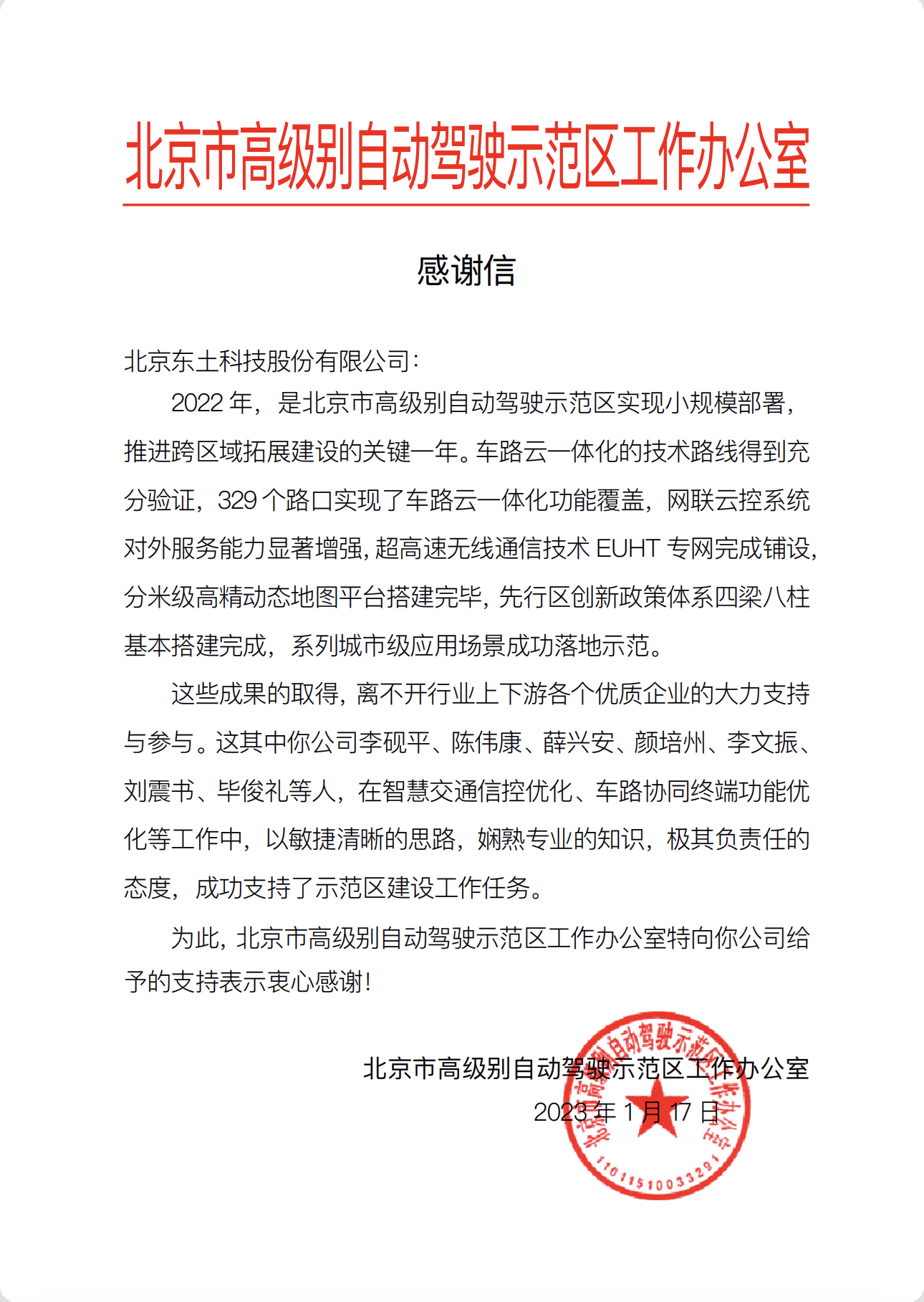 新春佳節之際,東土科技收到了一份特別的“過節禮”:公司獲得北京市高級別自動駕駛示范區工作辦公室的感謝信。這既是對公司智能交通產品及解決方案的肯定,也代表著對公司技術實力和服務態度的褒獎和認可。