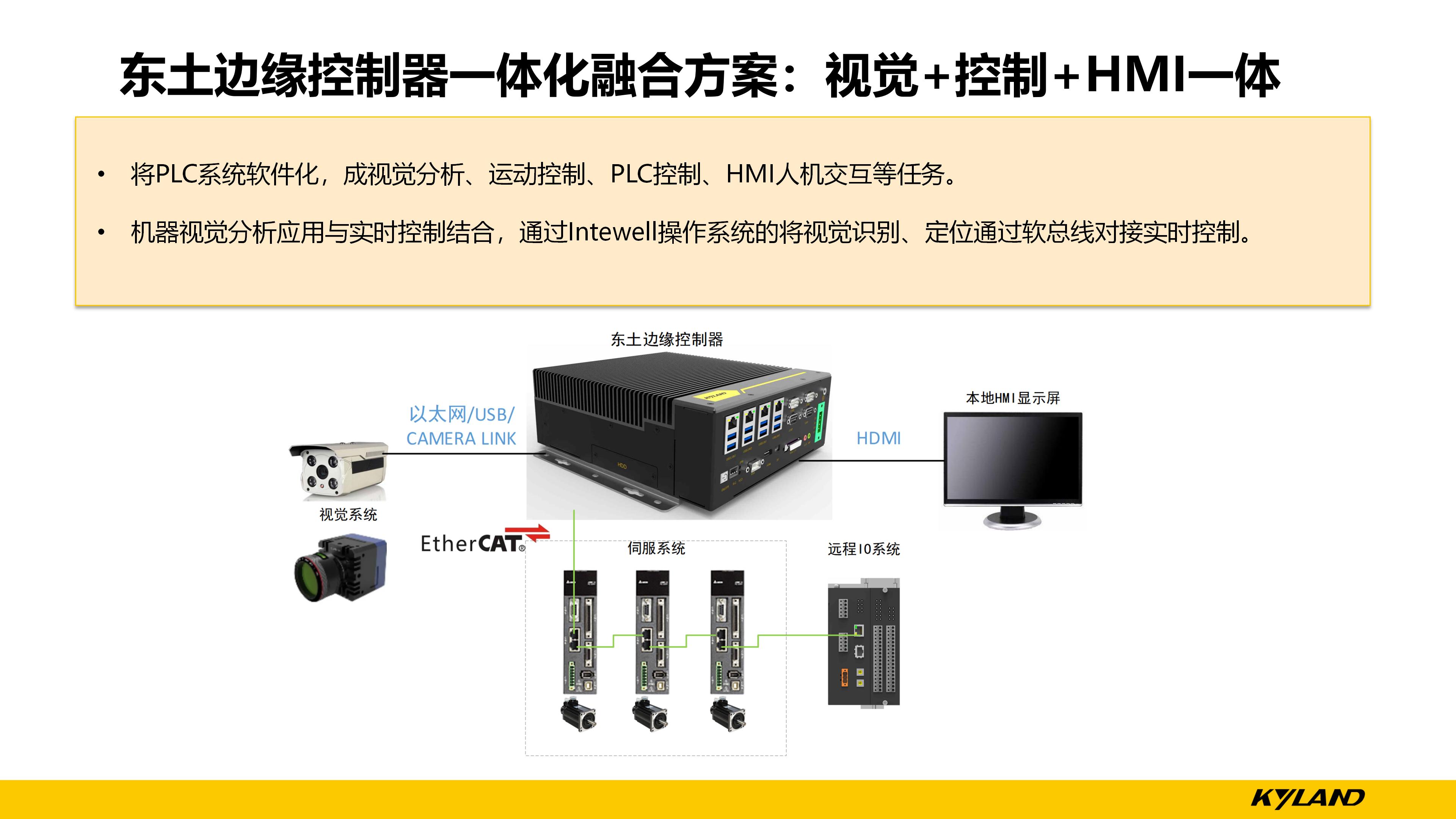 以往常規(guī)方式是工控機(jī)+運(yùn)動(dòng)控制板卡結(jié)合,將不同功能的獨(dú)立系統(tǒng)進(jìn)行集成,但是這樣的方案存在一定的缺點(diǎn),例如,各獨(dú)立系統(tǒng)的數(shù)據(jù)互通效率低下,同步控制效果差,開發(fā)時(shí)間長,集成難度大。而東土科技的視覺+控制+HMI一體化解決方案能夠?qū)LC軟件化,將機(jī)器視覺分析應(yīng)用與實(shí)時(shí)控制之間通過Intewell操作系統(tǒng)的虛擬軟總線進(jìn)行數(shù)據(jù)交互,具備數(shù)據(jù)同步快,開發(fā)時(shí)間短,集成易維護(hù)等優(yōu)點(diǎn),例如:視覺定位出來的物體空間坐標(biāo)位置點(diǎn),通過虛擬軟總線以變量形式發(fā)送給實(shí)時(shí)控制應(yīng)用,虛擬化PLC就可以快速執(zhí)行控制動(dòng)作,所有數(shù)據(jù)都是在邊緣控制器內(nèi)部完成的,而且比以往的分立式系統(tǒng)減少了空間占用,降低了運(yùn)維難度。