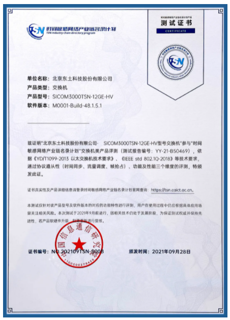東土科技全系列TSN工業網絡產品包含芯片、交換機、終端、交換軟件平臺、CNC及邊緣控制器等,其中SICOM3000TSN交換機于2021年9月28日在工業和信息化部主辦的“2021工業互聯網網絡創新大會”上榮獲首批“時間敏感網絡(TSN)產業鏈名錄計劃”測試認證證書,并已在重慶、西安、沈陽等地實際工廠進行應用,系統提供了微秒級確定性服務,保證實時性需求;產品可降低整個通信網絡復雜度,實現周期性數據和非周期性數據同時傳輸;有效提升了產線中工業控制流量傳輸的實時性、確定性和網絡的穩定性。
