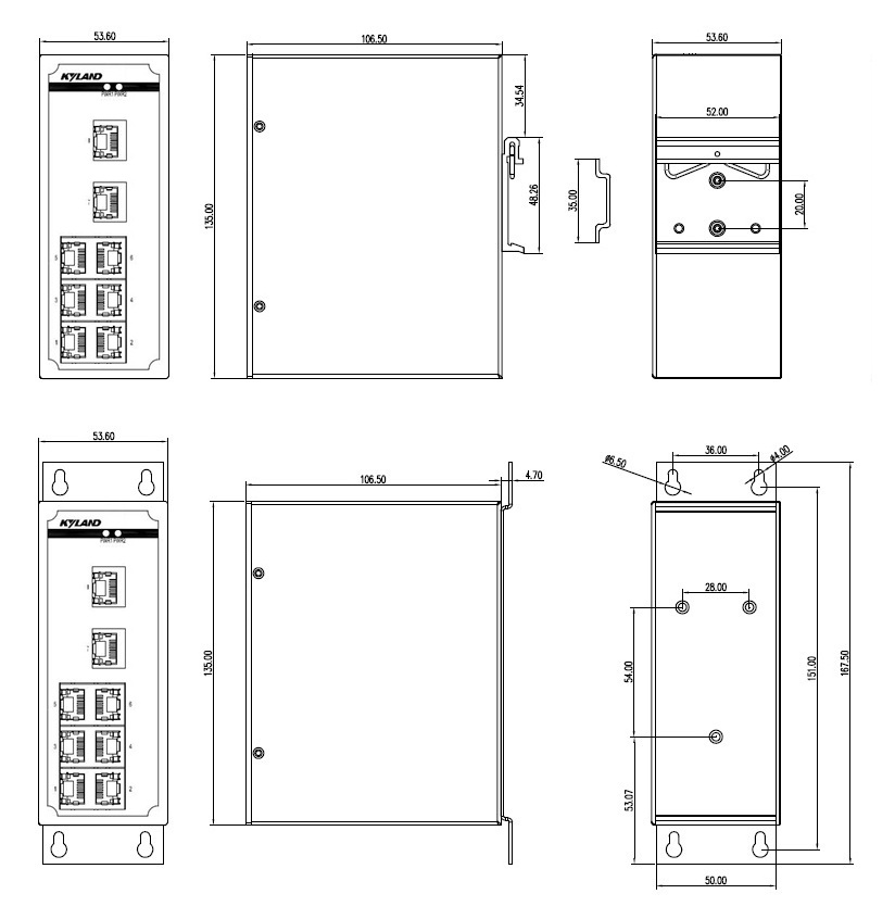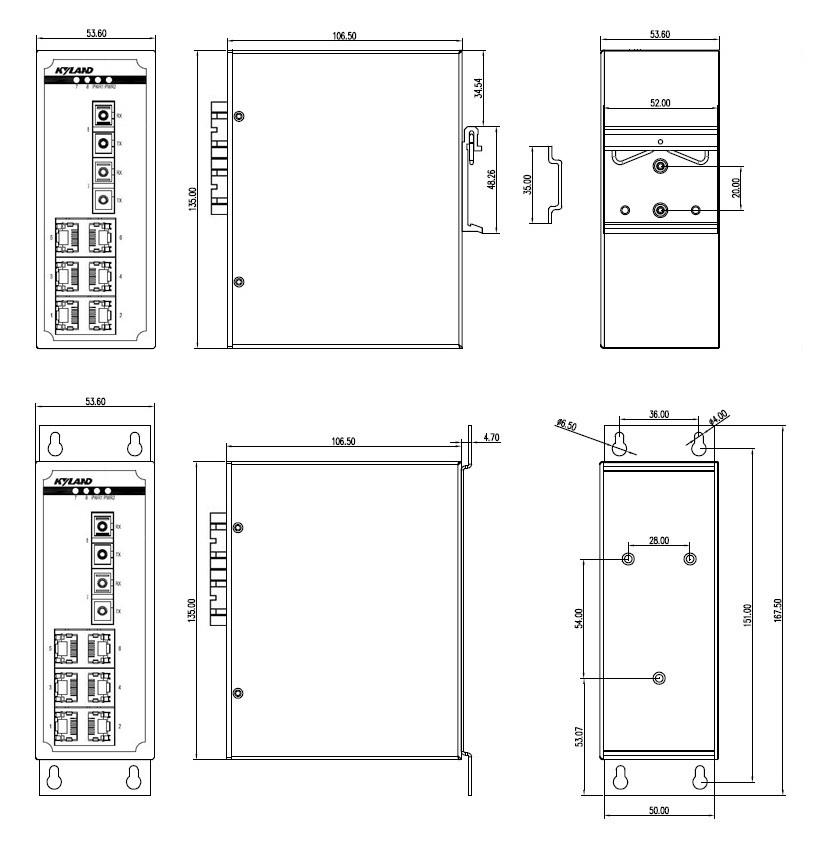 | 機械結構 | 外殼 金屬材質 散熱方式 自然冷卻,無風扇 防護等級 IP40 尺寸 53.6mm×135mm×106.5mm (W×H×D) 重量 0.76Kg 安裝方式 DIN卡軌式或壁掛式 |