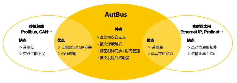 AUTBUS 是一種采用兩線非橋接媒介,具有多節點、高帶寬、高實時、可 遠距離傳輸的工業現場總線。總線數據帶寬達到 100Mbps,最大傳輸距離 500 米,最小循環周期 8 微秒,最大節點數 256 個,傳輸誤碼率優于 10-11,總線 時鐘抖動 10ns,同時支持總線虛擬化和非對稱加密。AUTBUS 用于過程控制和離散控制等自動化控制工業現場的實時數據和非實時數據的傳輸與應用,兼容 ISO/IEC/IEEE 8802-3 以太網、IPv6 等應用。