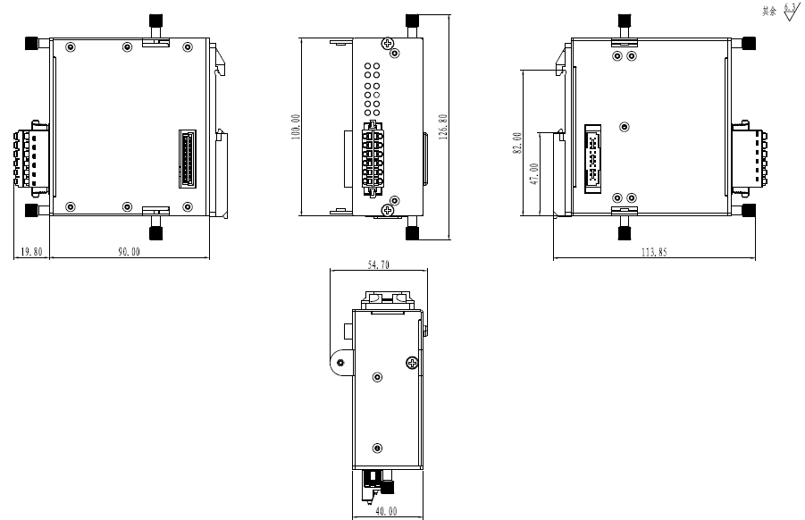 | 機械結構 | 機械結構 鋁質外殼 防護等級 IP30 尺寸 40mm x 100mm x 90mm (W x H x D) 整機重量 500g 安裝方式 導軌安裝 |
