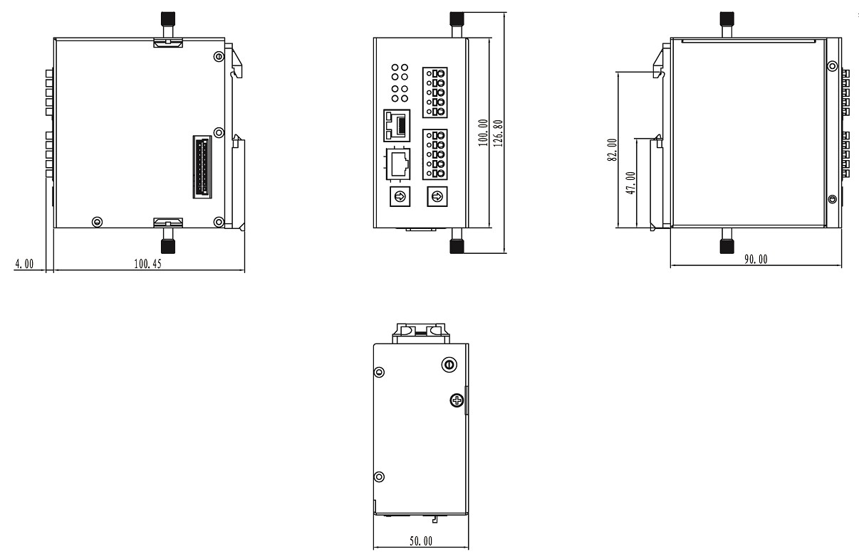 | 機械結構 | 機械結構 鋁質外殼 防護等級 IP30 尺寸 50mm x 100mm x 90mm (W x H x D) 整機重量 500g 安裝方式 導軌安裝 |