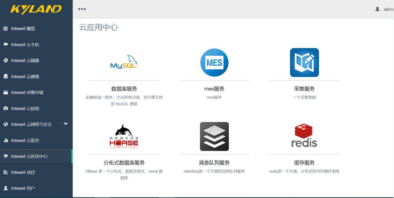 | 云應用中心 (可選) | 支持中間件及應用在云應用中心統一展示 支持中間件及應用一鍵式部署:用戶只需一鍵點擊應用,即可獲取相應資源,直接部署在云平臺中供使用。 應用包括: 支持關系型數據庫mysql 5.7,支持數據庫集群功能。 支持文檔數據庫mongdodb, 支持應用用戶統一權限管理 支持ftp文件傳輸應用:http訪問方式 支持列式數據庫HBase 支持 kafka 消息隊列 支持 mqtt 消息隊列 支持預裝東土KyVista全景可視化組態軟件 支持預裝東土KyMOM制造執行系統 支持預裝東土AHM資產健康管理 支持預裝東土NMS綜合網絡管理 支持預裝東土ICMS工業計算機管理系統 ![]() |