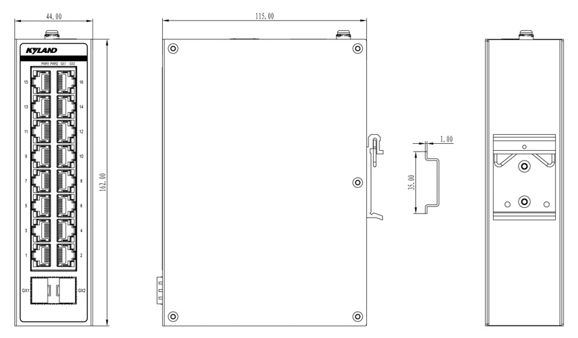 | 機械結構 | 外殼 金屬材質(zhì) 散熱方式 自然冷卻,無風扇 防護等級 IP40 尺寸 44mm×162mm×115mm (W×H×D) 重量 0.5Kg 安裝方式 DIN卡軌式或壁掛式 |