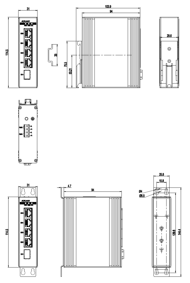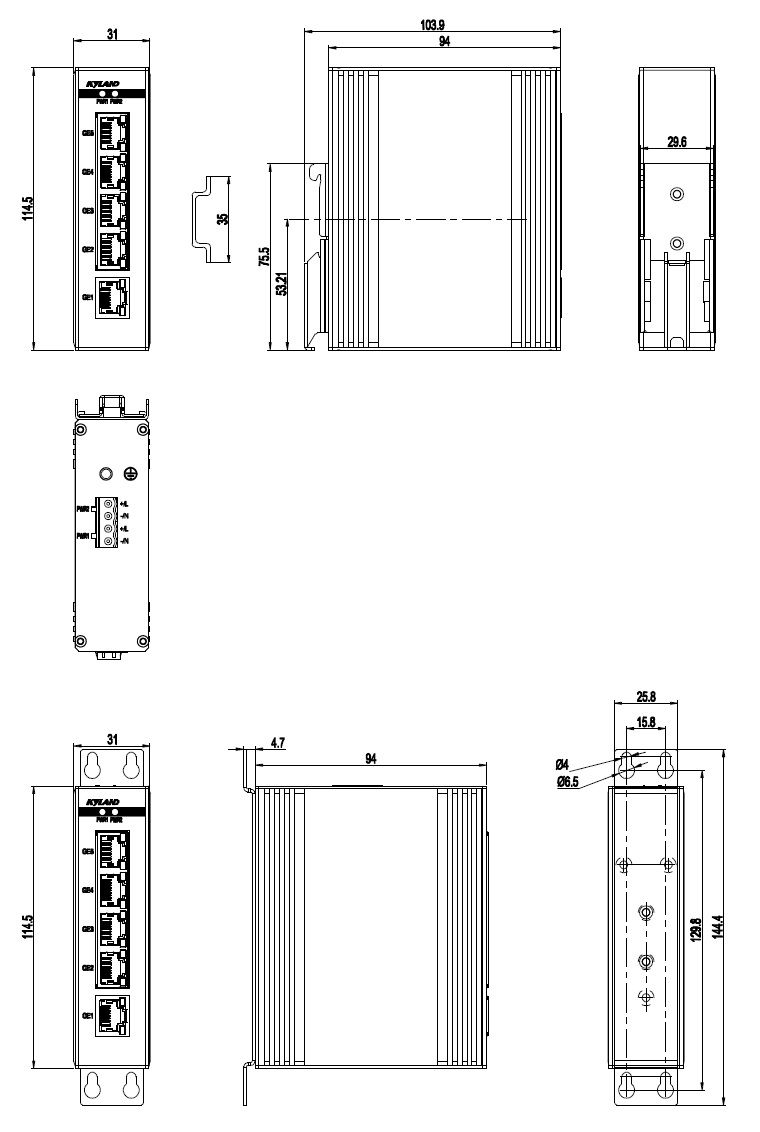 | 機械結(jié)構(gòu) | 外殼 金屬材質(zhì) 散熱方式 自然冷卻,無風(fēng)扇 防護等級 IP40 尺寸 31mm×114.5mm×94mm (W×H×D) 重量 0.3Kg 安裝方式 DIN卡軌式或壁掛式 |