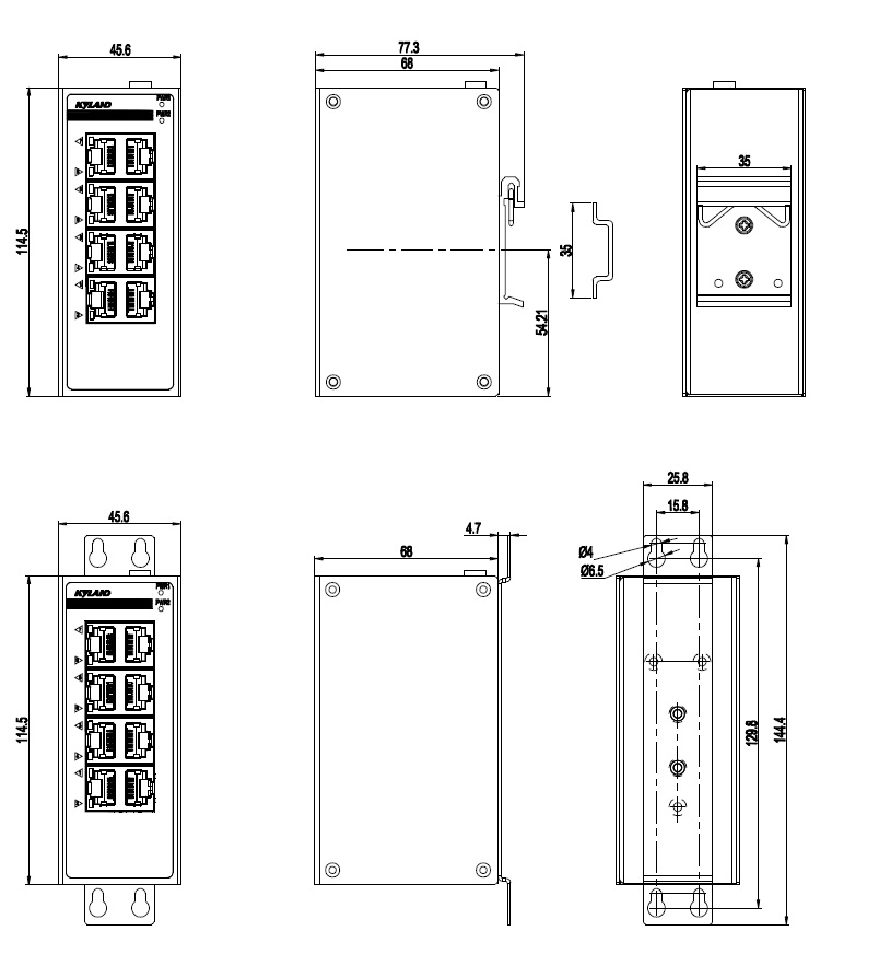 | 機械結構 | 外殼 金屬材質 散熱方式 自然冷卻,無風扇 防護等級 IP30 尺寸 45.6mm×114.5mm×68mm (W×H×D) 重量 0.3Kg 安裝方式 DIN卡軌式或壁掛式 |