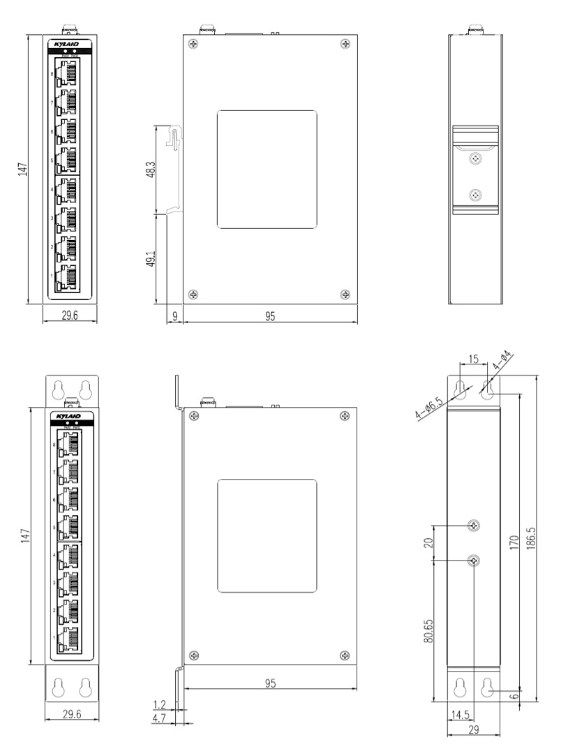 | 機械結構 | 外殼 金屬材質 散熱方式 自然冷卻,無風扇 防護等級 IP30 尺寸 29.6mm×147mm×95mm (W×H×D) 重量 0.3Kg 安裝方式 DIN卡軌式或壁掛式 |