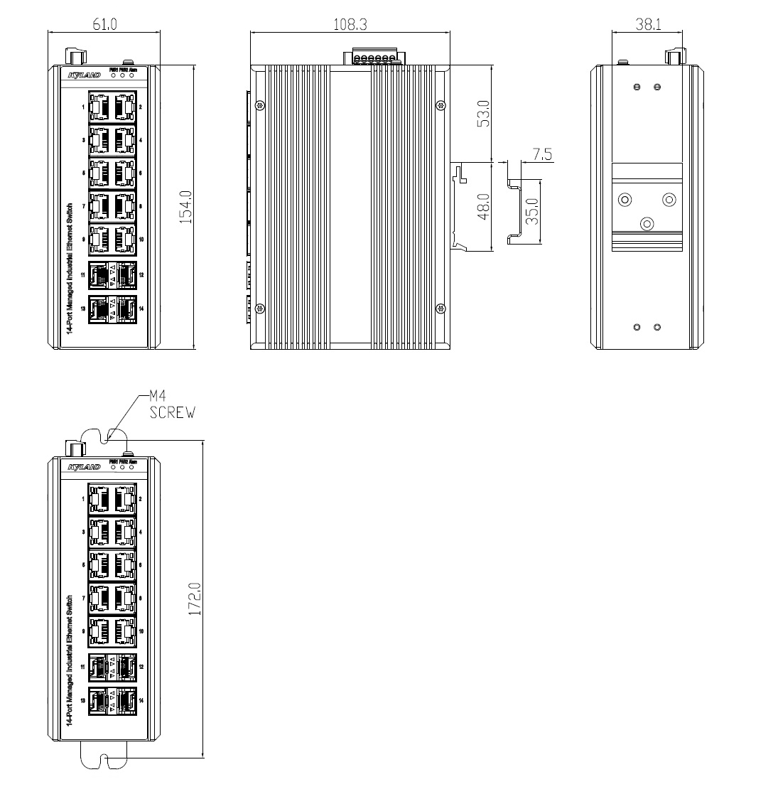 | 機械結構 | 外殼 金屬材質 散熱方式 自然冷卻,無風扇 防護等級 IP30 尺寸 108mmx154mmx61mm(W×H×D) 重量 1.4Kg 安裝方式 DIN卡軌式或壁掛式 |